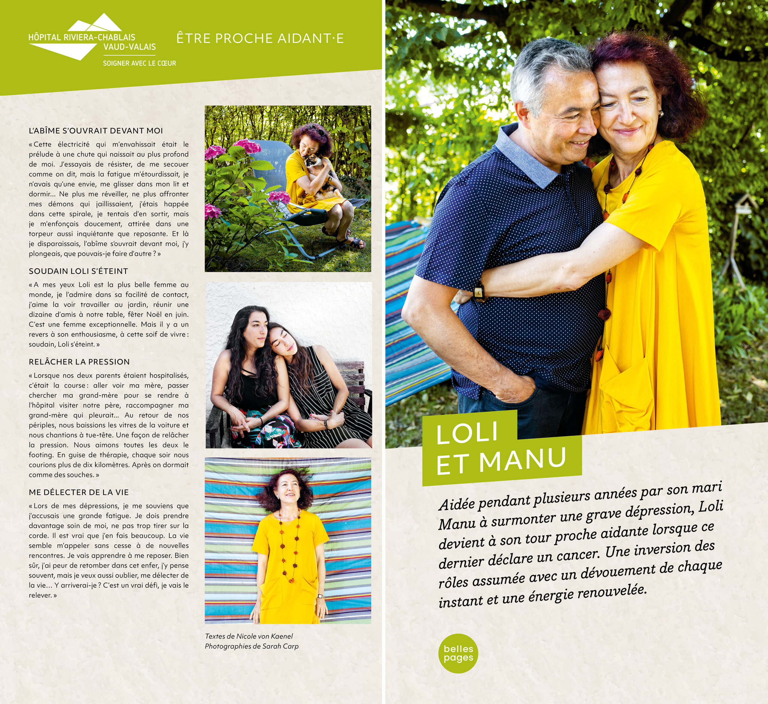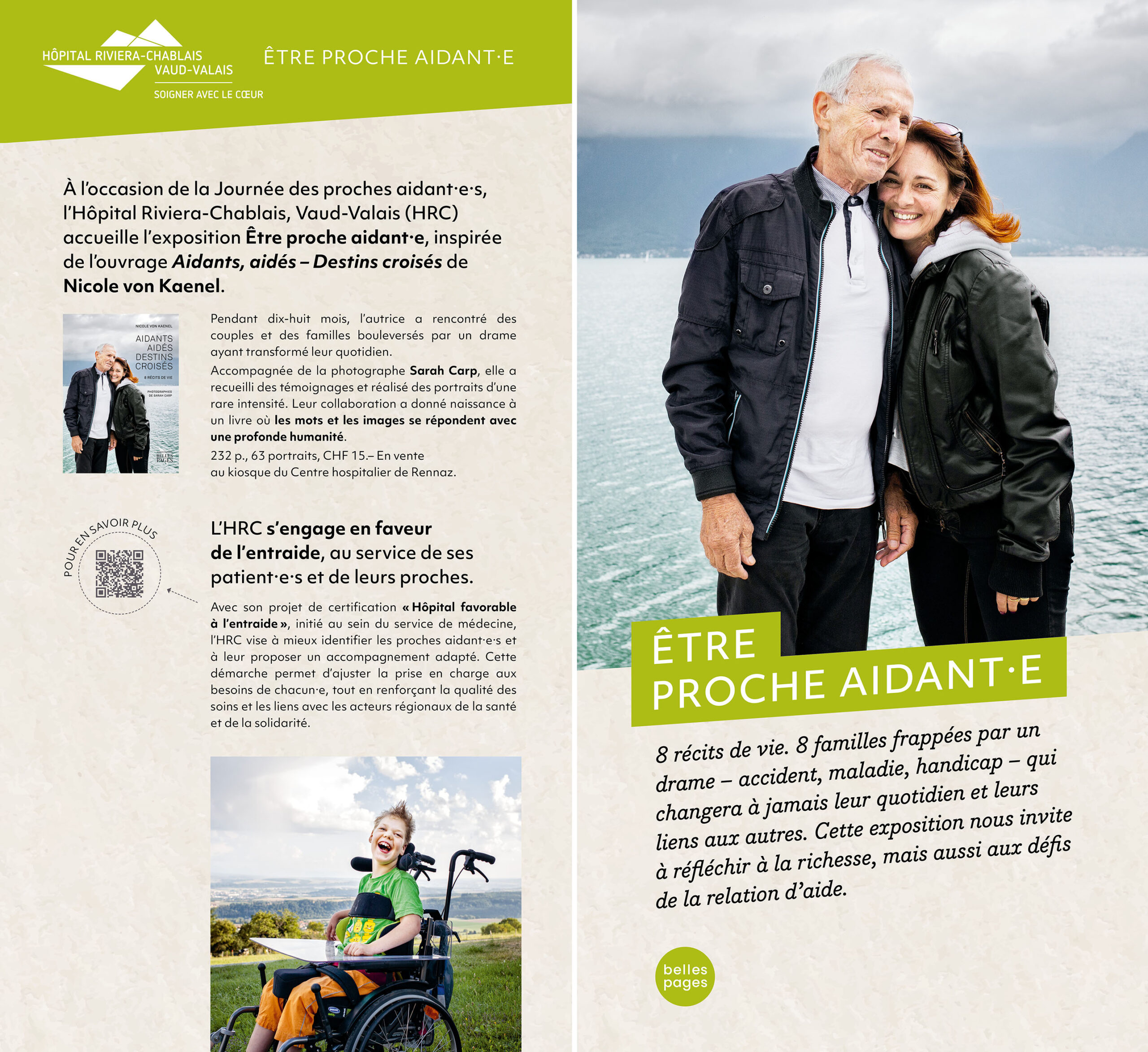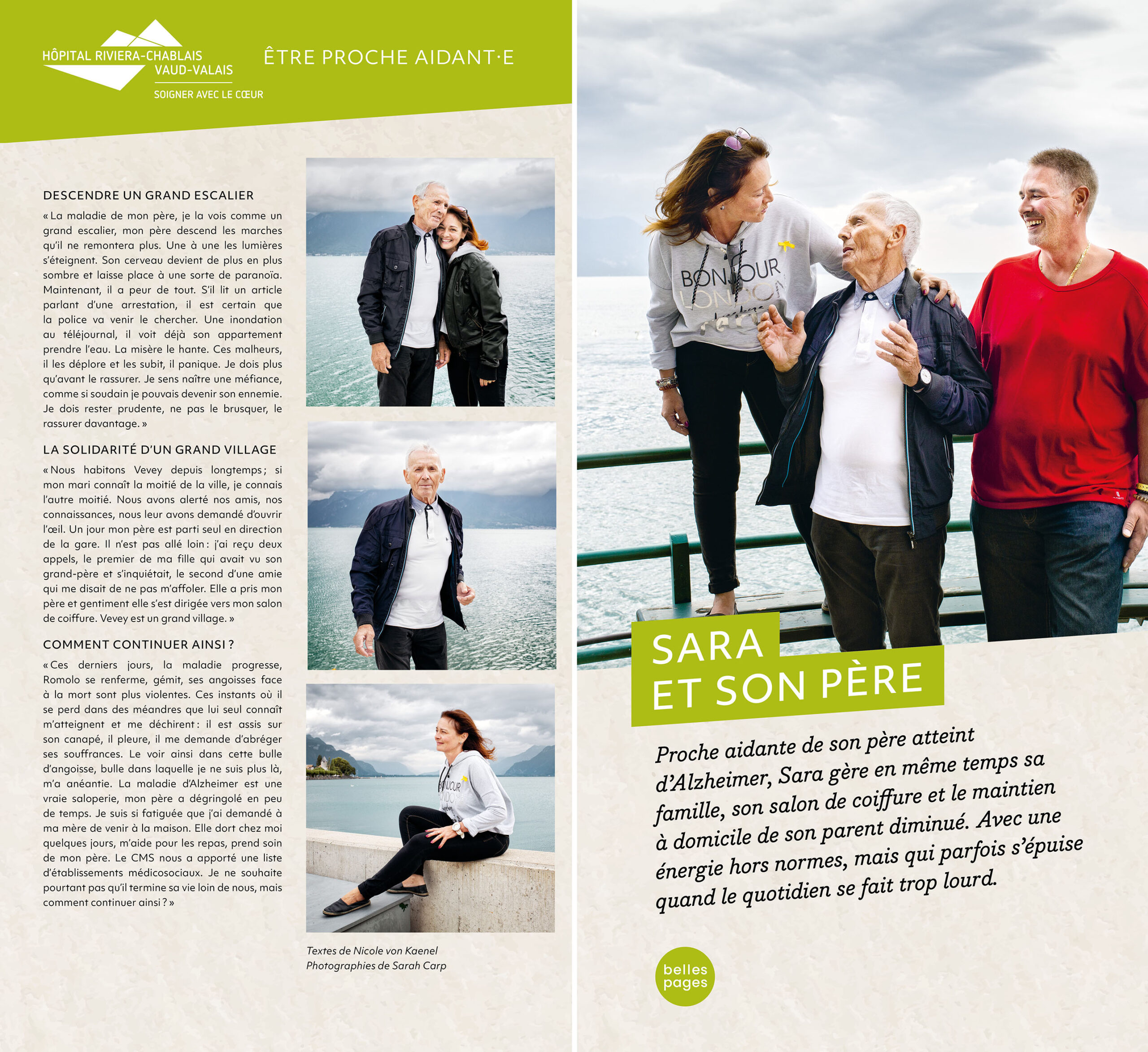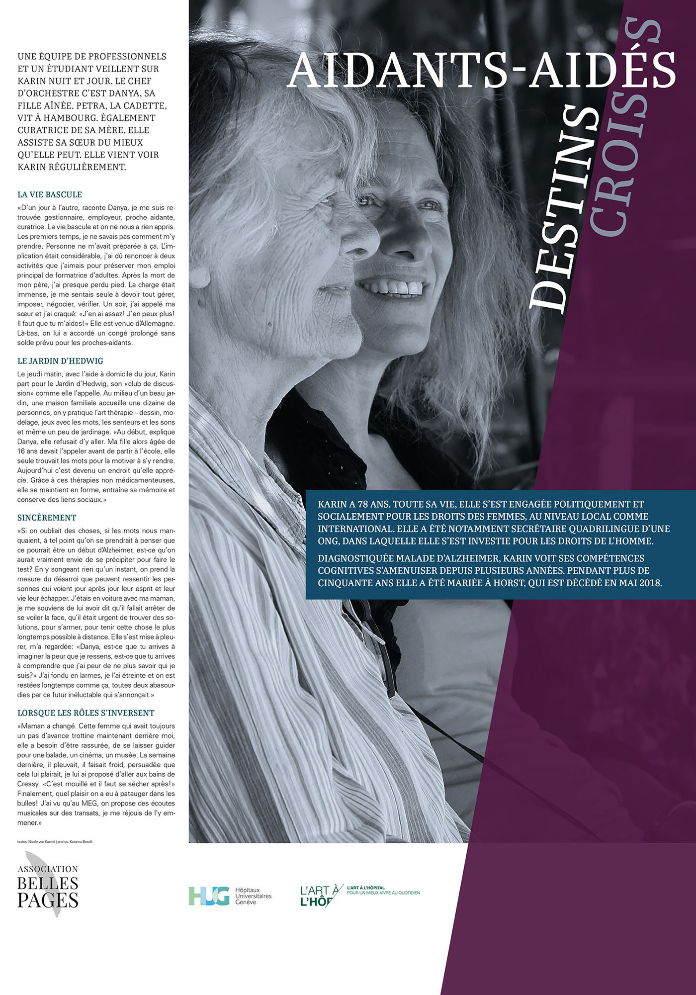 Insérée dans les structures complexes de l’espace d’accueil, l’exposition des HUG présentait en outre un panneau spécial recto-verso racontant le parcours d’une patiente et de sa fille proche-aidante. Nicole von Kaenel se chargea de la rédaction des textes et supervisa la réalisation avec la photographe Katarina Boselli.