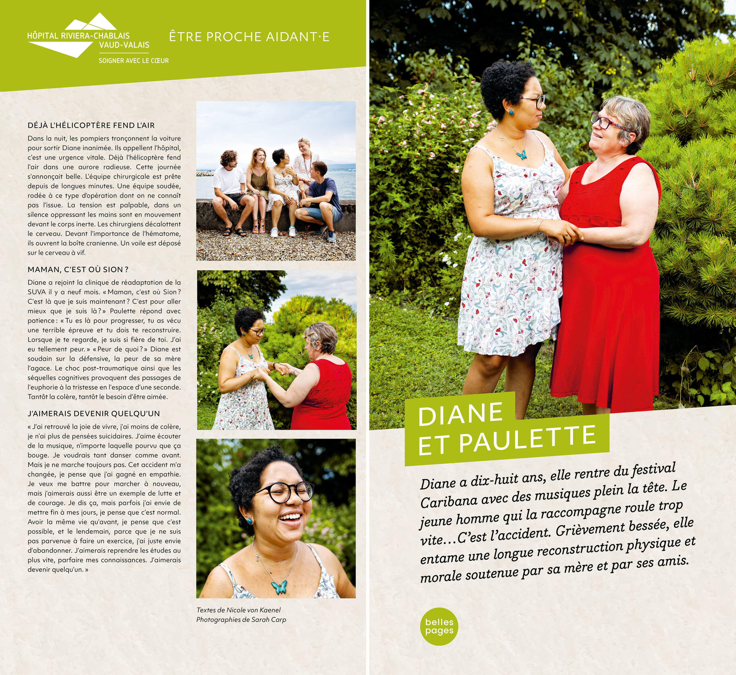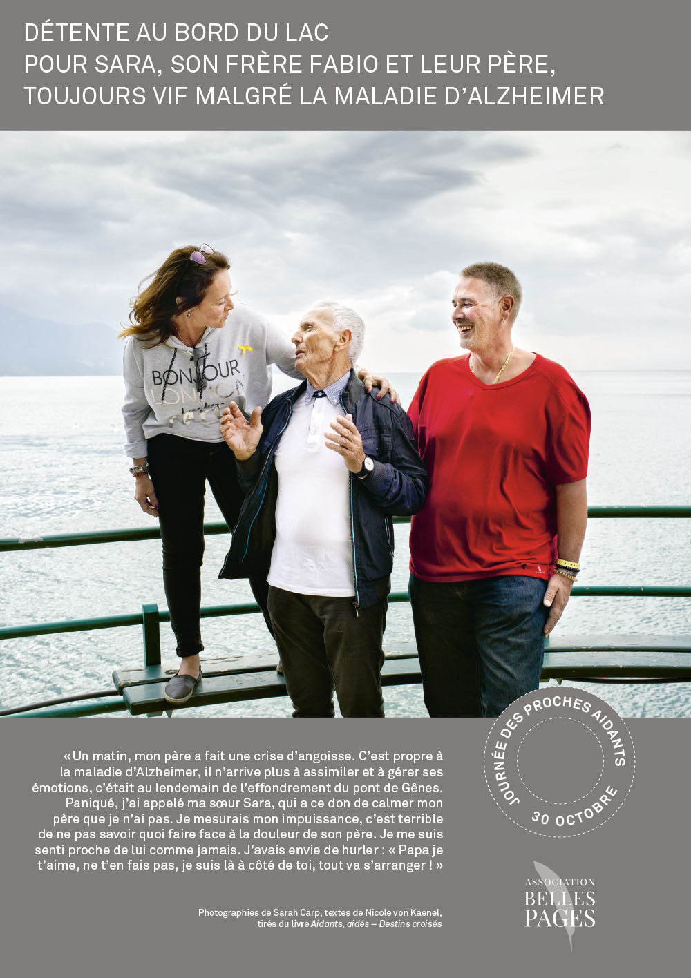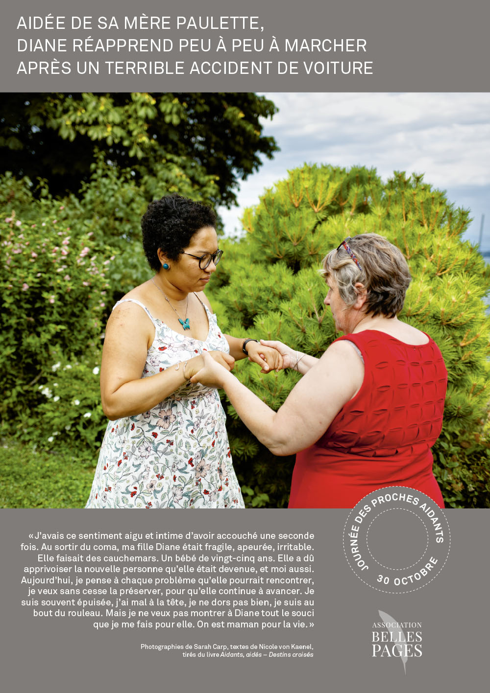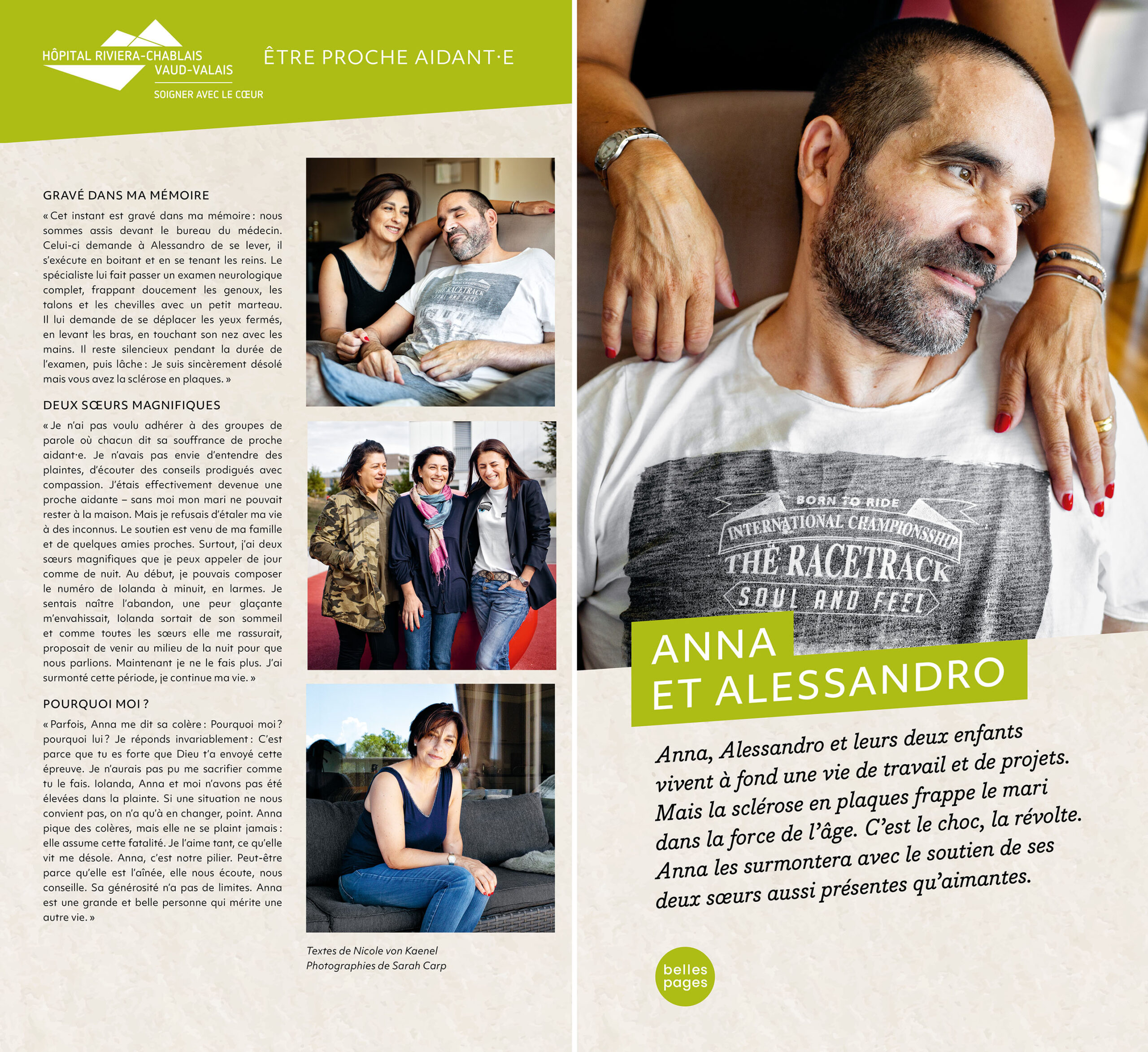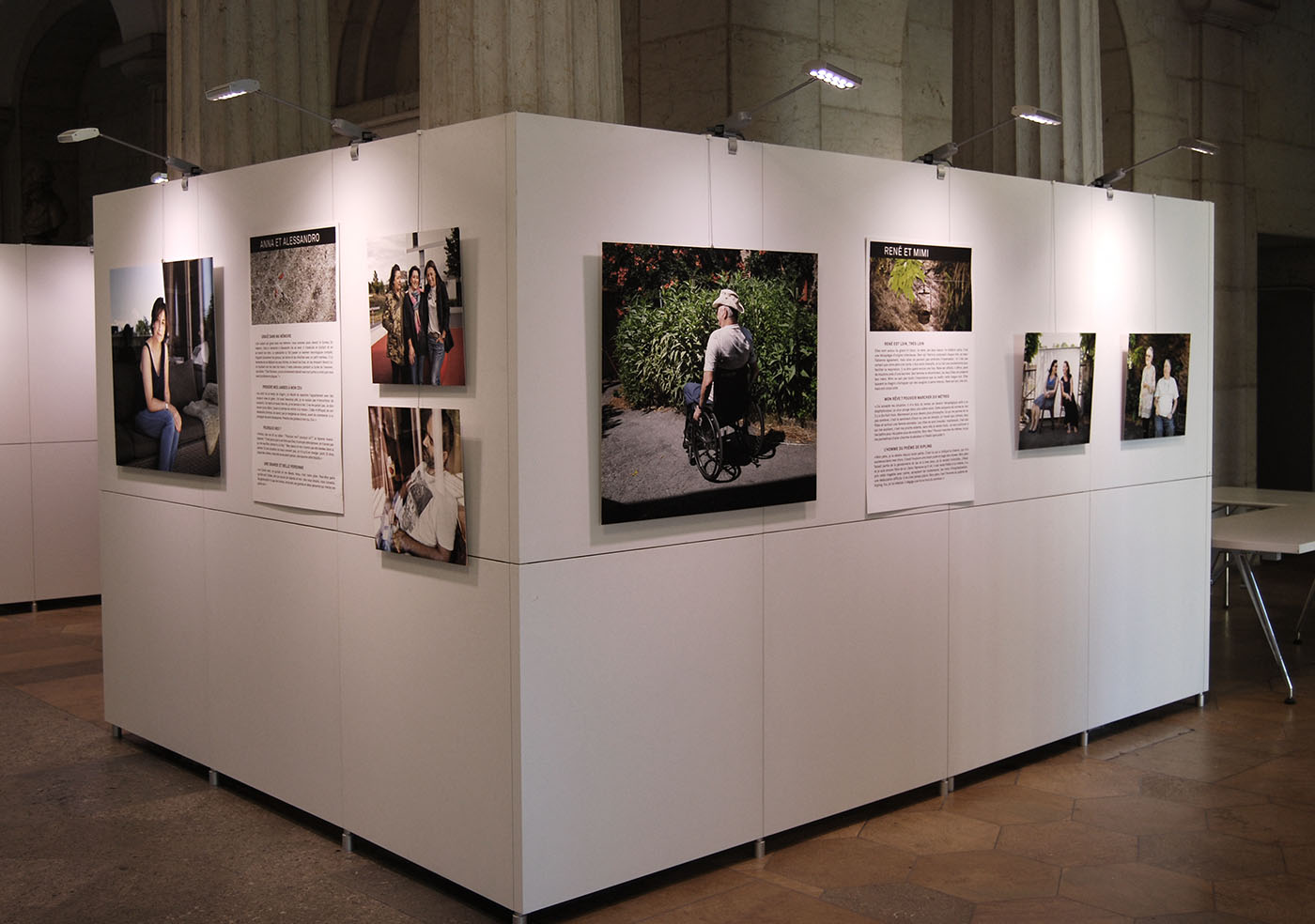 Insérée dans les structures complexes de l’espace d’accueil, l’exposition des HUG présentait en outre un panneau spécial recto-verso racontant le parcours d’une patiente et de sa fille proche-aidante. Nicole von Kaenel se chargea de la rédaction des textes et supervisa la réalisation avec la photographe Katarina Boselli.