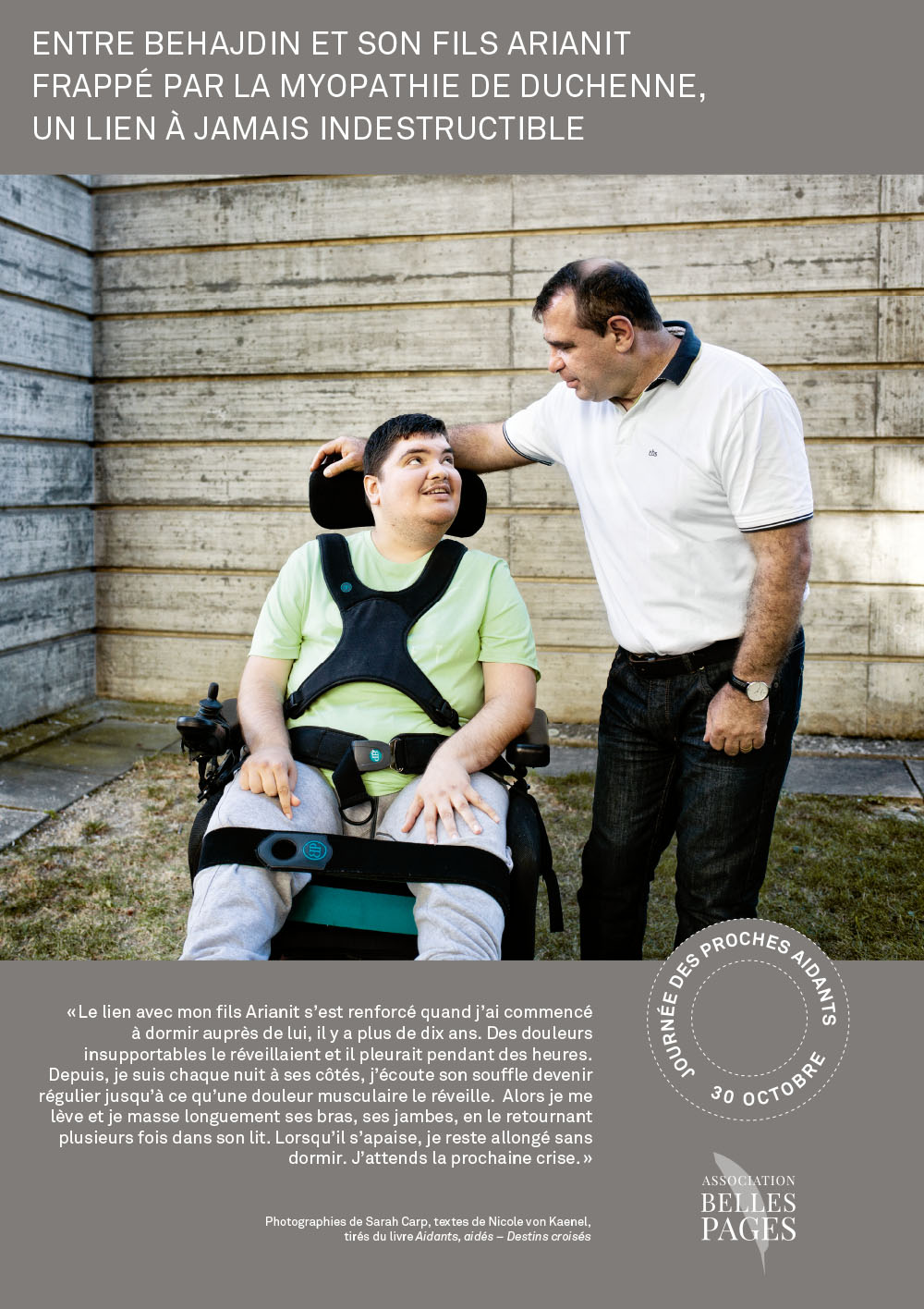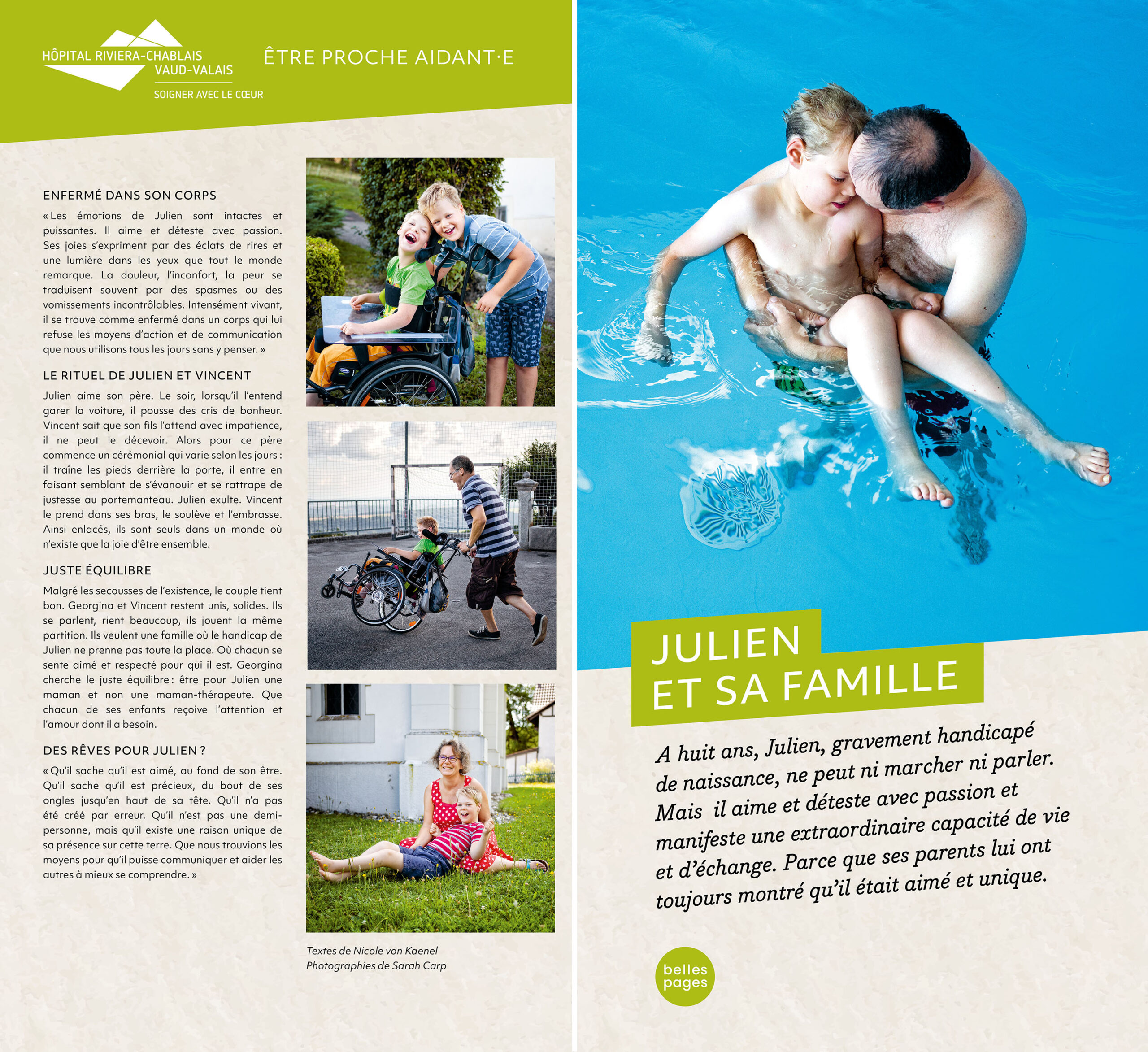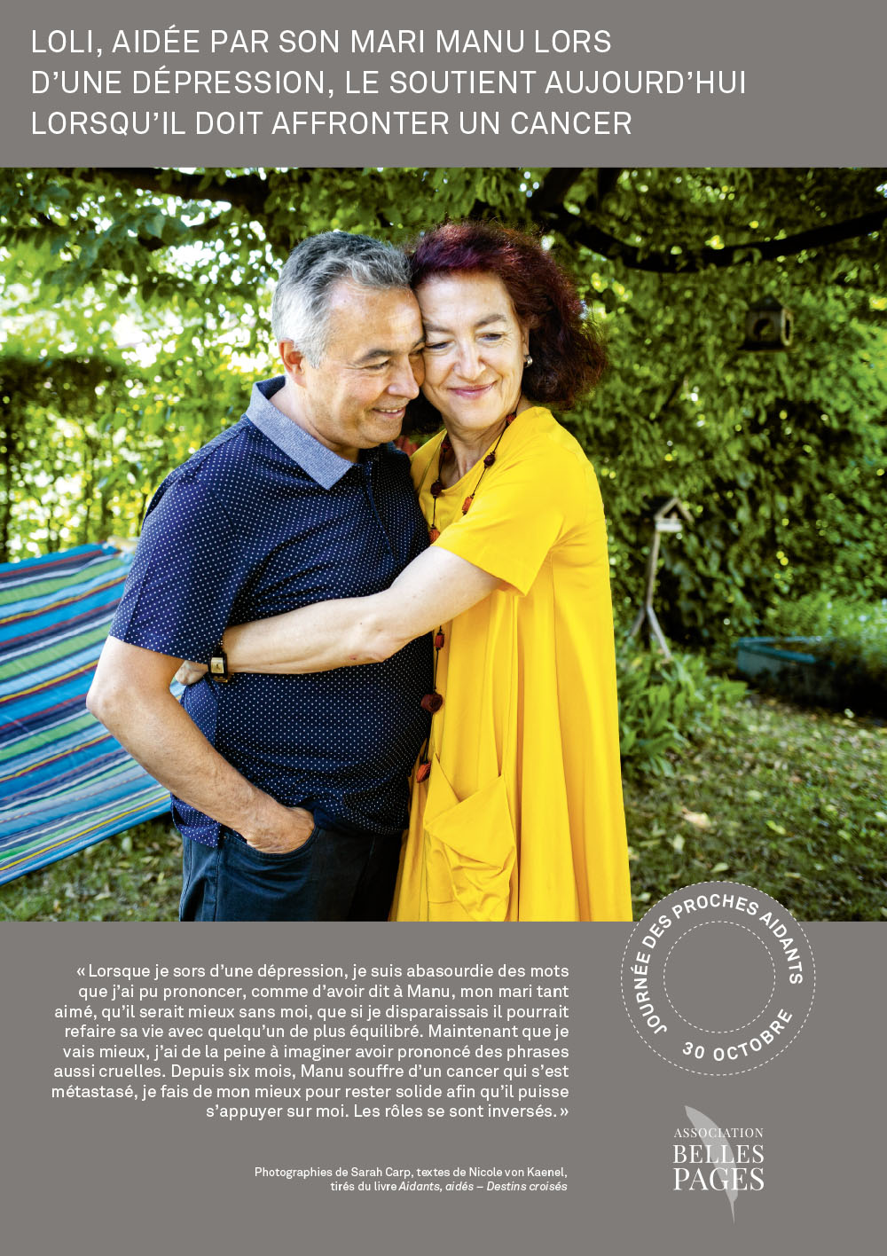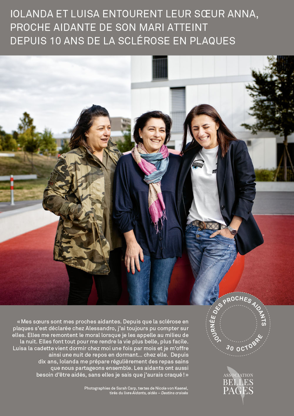 Insérée dans les structures complexes de l’espace d’accueil, l’exposition des HUG présentait en outre un panneau spécial recto-verso racontant le parcours d’une patiente et de sa fille proche-aidante. Nicole von Kaenel se chargea de la rédaction des textes et supervisa la réalisation avec la photographe Katarina Boselli.